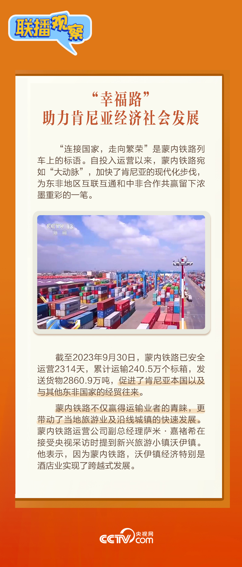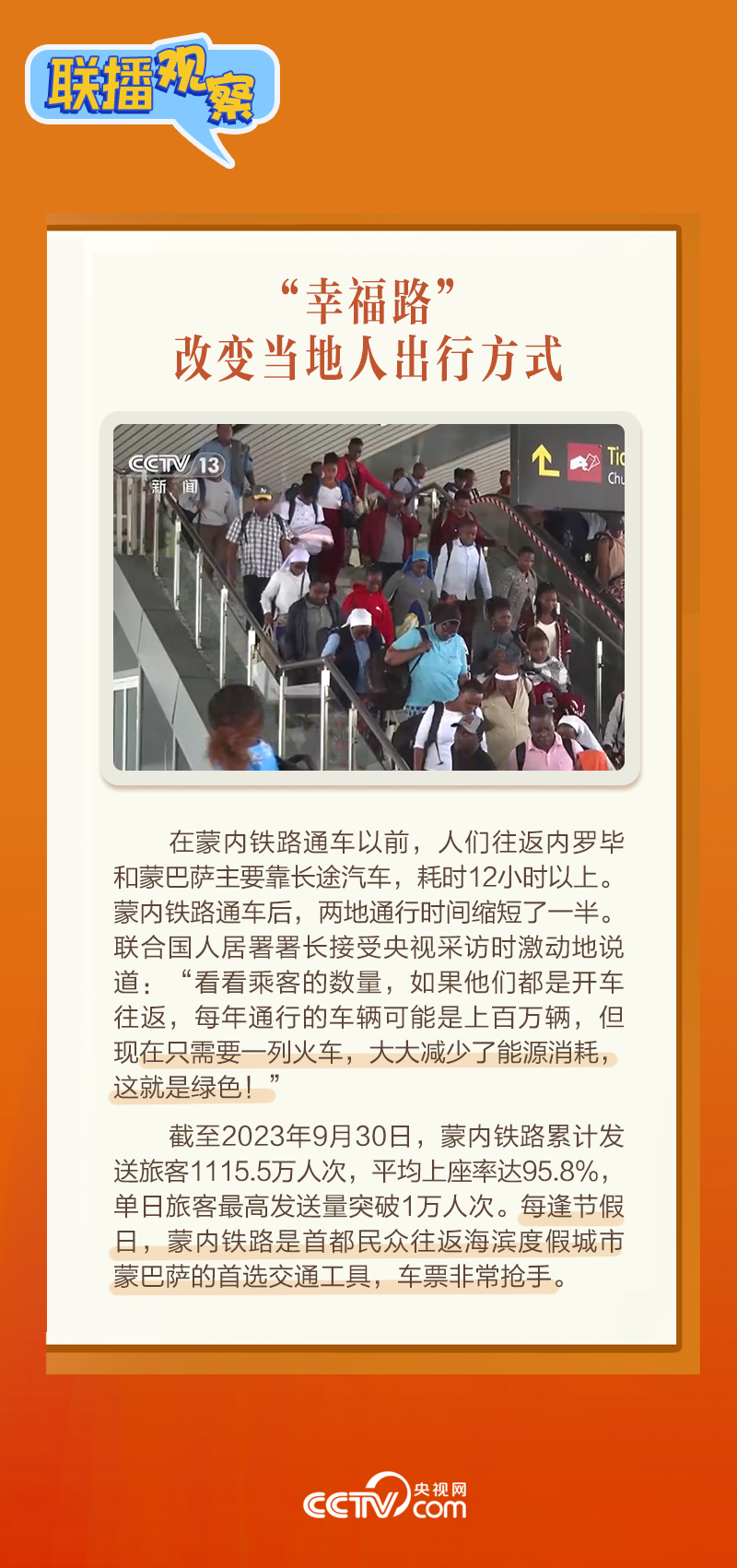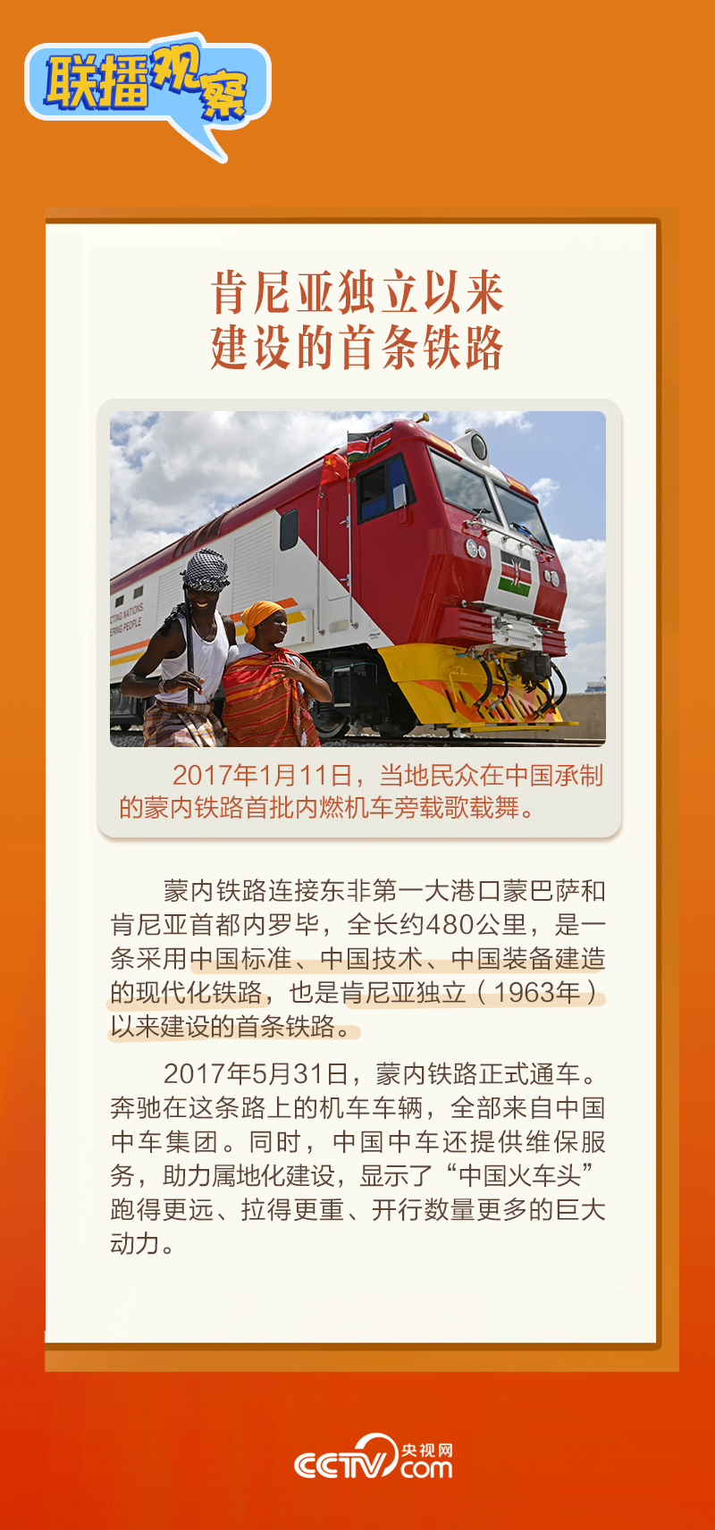 此前,習(xí)主席在外事活動(dòng)中多次提及蒙內(nèi)鐵路,《新聞聯(lián)播》也持續(xù)關(guān)注這條路的建設(shè)及開(kāi)通后的運(yùn)營(yíng)情況。這條“幸福路”有何特別之處,習(xí)主席為何頻頻提及?它的建成通車(chē)給當(dāng)?shù)貛?lái)哪些變化?《聯(lián)播觀(guān)察》邀您一同了解。