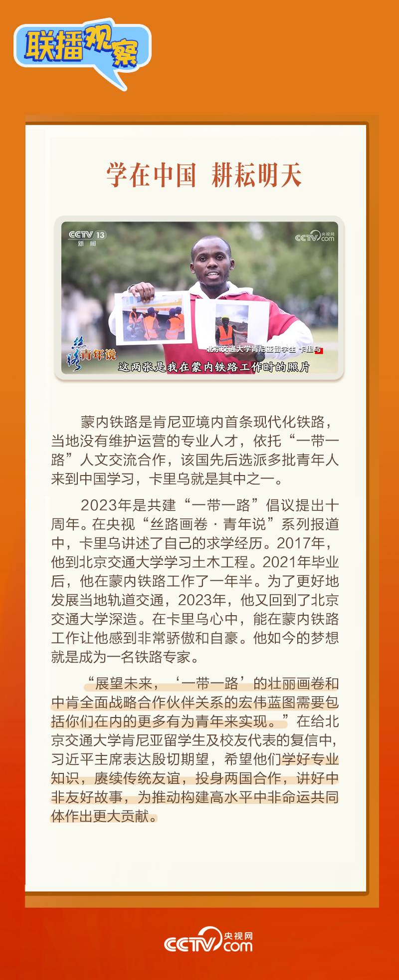 聯(lián)播+日前,北京交通大學(xué)肯尼亞留學(xué)生及校友代表致信習(xí)近平主席,表示非常高興來(lái)到中國(guó)學(xué)習(xí)鐵路運(yùn)營(yíng)管理知識(shí)。1月17日,習(xí)近平主席復(fù)信表達(dá)欣慰和喜悅之情,“蒙內(nèi)鐵路是中肯共建‘一帶一路’旗艦項(xiàng)目和成功典范。我高興地看到,你們因這條‘幸福路’與中國(guó)結(jié)緣……”