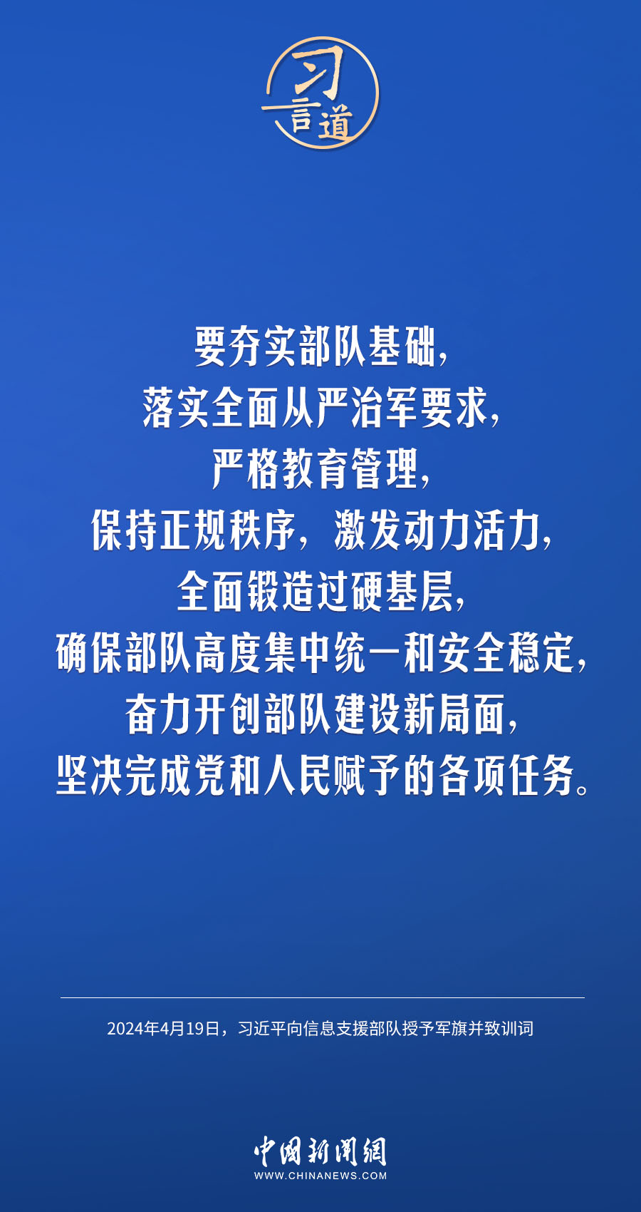 中國(guó)人民解放軍信息支援部隊(duì)成立大會(huì)19日在北京八一大樓隆重舉行。中共中央總書記、國(guó)家主席、中央軍委主席習(xí)近平向信息支援部隊(duì)授予軍旗并致訓(xùn)詞,代表黨中央和中央軍委向信息支援部隊(duì)全體官兵致以熱烈祝賀。他強(qiáng)調(diào)——