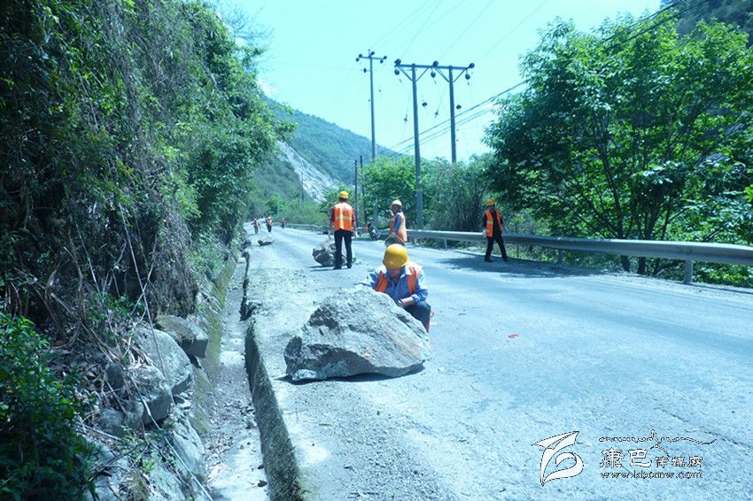 養(yǎng)護職工正在清除震后零星飛石。