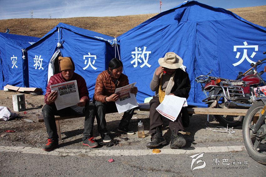 康定地震發(fā)生以來,前往災區(qū)采訪的記者堅持向災區(qū)群眾帶去《甘孜日報》藏漢文報,讓群眾在安置點就能了解黨委、政府組織抗震救災的情況。圖為江巴村民正在救災帳篷外看報。 李慶林 攝影報道