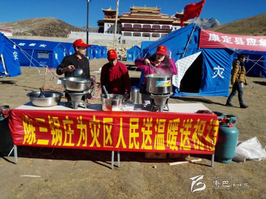 11月28日中午,記者來(lái)到康定塔公鎮(zhèn)祖慶小學(xué)采訪。在現(xiàn)場(chǎng),一群戴著紅帽子的人正在將熱氣騰騰的紅燒肉一勺一勺的分發(fā)到同學(xué)們碗中。仔細(xì)一看,現(xiàn)場(chǎng)還有一幅標(biāo)語(yǔ),上面寫著“陳三鍋莊為災(zāi)區(qū)人民送溫暖送祝福”的字樣。記者揉了揉眼,確定沒看錯(cuò)。原來(lái),陳三鍋莊是關(guān)了康定的門店,組織人員到災(zāi)區(qū)參與抗震救災(zāi)來(lái)了。