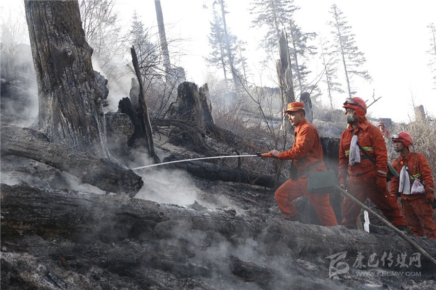 210日,火頭蔓延至火場(chǎng)東北一線,參戰(zhàn)官兵發(fā)現(xiàn)幾處被冰雪覆蓋的水源,火場(chǎng)前指決心改變戰(zhàn)法,采用7組水泵串聯(lián)接力向火場(chǎng)供水主攻明火,常規(guī)機(jī)具輔助配合消除煙點(diǎn)的方式,將部隊(duì)分為水泵和常規(guī)機(jī)具兩個(gè)梯隊(duì),在火場(chǎng)火勢(shì)最為猛烈的東北側(cè)展開滅火作戰(zhàn)。參戰(zhàn)官兵用自身攜帶的鍬鎬奮力破冰面抽水,在水泵的助力下,明火得到了有效壓制并逐步熄滅。隨后,部隊(duì)和地方群眾全部轉(zhuǎn)入火場(chǎng)清理看守階段。