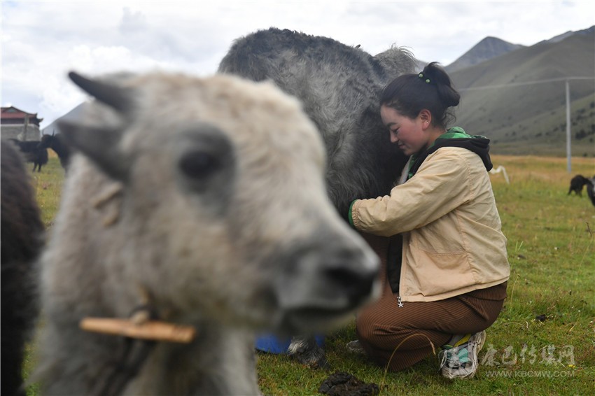 康定市呷巴鄉(xiāng)俄達(dá)門巴村牧民正在擠牦牛奶。 新華社 發(fā)