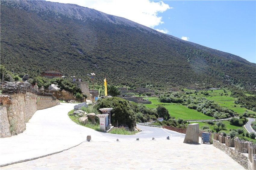 從觀景平臺(tái)向村子進(jìn)發(fā),一棟棟用石塊砌成的藏房次第映入眼簾,每一棟藏房都有獨(dú)立的院落,院墻上是堆放整齊的木柴,墻邊是造型別致的花臺(tái),有的房頂上還掛著五星紅旗。走到村口,黑化通村路變成了硬化聯(lián)戶路,道路寬敞整潔,路旁有太陽(yáng)能路燈、電子監(jiān)控、綠化花草和公共廁所;村中央的廣場(chǎng)上聚滿了人,他們有的是外來(lái)游客、有的是當(dāng)?shù)卮迕?,有的在曬著太?yáng)閑聊,有的在對(duì)著美景拍照。在村里,記者還發(fā)現(xiàn)有幾個(gè)小賣(mài)部、不少私家車(chē)和好幾大片長(zhǎng)勢(shì)良好的菜地,地里有一些人在勞作。