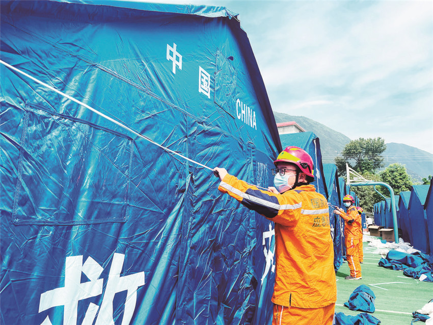 9月8日,當(dāng)救援隊(duì)伍陸續(xù)離開(kāi)磨崗嶺村的時(shí)候,一頂頂藍(lán)色的帳篷已經(jīng)搭建完畢,村民們已經(jīng)全數(shù)搬進(jìn)救災(zāi)帳篷。記者獲悉,后續(xù)救援物資將通過(guò)被搶通的道路陸續(xù)運(yùn)抵村子。