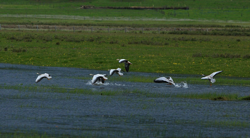斑頭雁在白玉縣藍(lán)松湖上“飛舞”。 風(fēng)語 攝