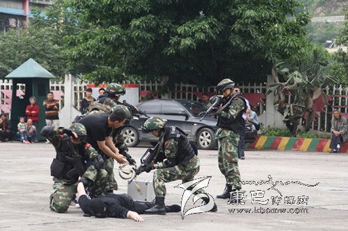 近日,瀘定縣“2014反恐維穩(wěn)處突演練”在瀘定兵站舉行。 來自該縣公安、武警、消防、衛(wèi)生等部門的100余名參演人員以昂揚的斗志、精湛的技能,先后演練了盾牌術(shù)、消防滅火、反恐應(yīng)急戰(zhàn)術(shù)、處置群體性突發(fā)事件等科目。此次演練,展現(xiàn)了該縣反恐維穩(wěn)隊伍堅強的戰(zhàn)斗力和優(yōu)良的精神風貌,檢驗了反恐維穩(wěn)隊伍的專業(yè)素質(zhì),全面提升了該縣處置突發(fā)事件的能力。圖為演練現(xiàn)場。(周鵬 羅楚凱 袁帥 攝影報道)