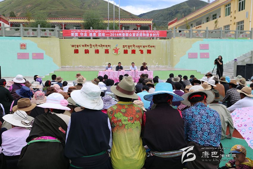“2014州委群眾宣講團(tuán)和諧鄉(xiāng)村行”宣講團(tuán)9月11日下午來到道孚縣格西鄉(xiāng),在格西鄉(xiāng)中心校內(nèi),群眾們?cè)缭绲絹恚P腿坐在塑膠跑道上,認(rèn)真聽州民干校高級(jí)講師仁志降澤用藏文講述的一個(gè)又一個(gè)通俗易懂的小故事,感知“愛國 守法 感恩 團(tuán)結(jié)”八個(gè)字。他還結(jié)合具體實(shí)例講述法律、交通方面知識(shí),大家聽得聚精會(huì)神,時(shí)而被降澤老師的小故事逗的捧腹大笑,時(shí)而陷入了深深的思考。