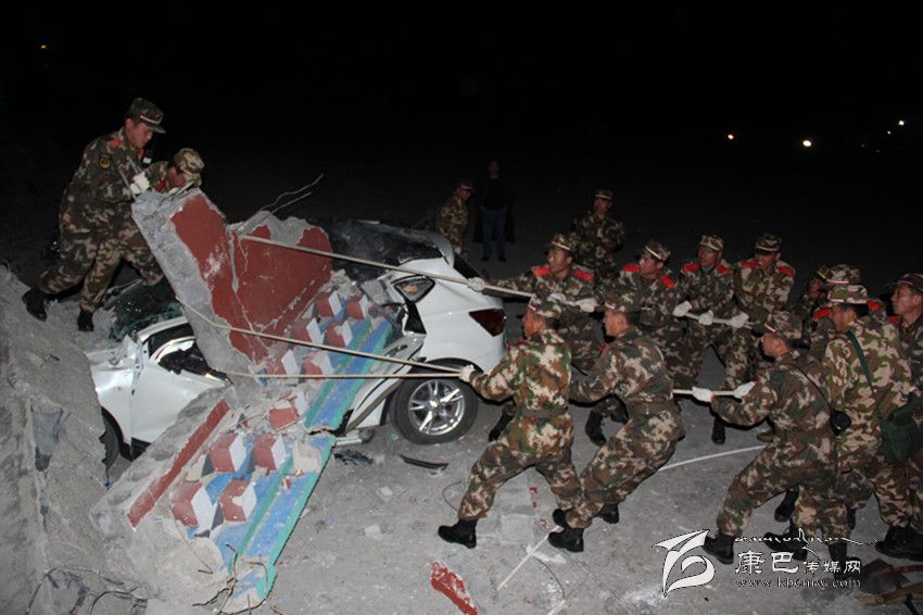 第一批進(jìn)入震中的甘孜森林支隊(duì)官兵搶救被困車輛。翁小鵬 攝