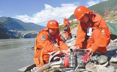 圖為徐驊(右)和戰(zhàn)士在架設水泵準備滅火。 (武警四川省森林總隊甘孜州支隊供圖)