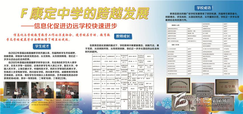 2002年以來康定中學立足民族地區(qū)教育實際,依托成都七中優(yōu)質教育,先后開通成都七中高中直播班、初中錄播班,建成初中遠程直錄播教學AB平臺,實現(xiàn)了與國內名校共享優(yōu)質教學資源的目標,將網課教學打造成學校教育品牌。經過近5000名師生員工的不懈努力,2013年來,康定中學連續(xù)4年高考硬上本科人數(shù)突破200人大關。先后有8名學生被北京大學和清華大學錄取。中考綜合評比連續(xù)9年保持全州第一。