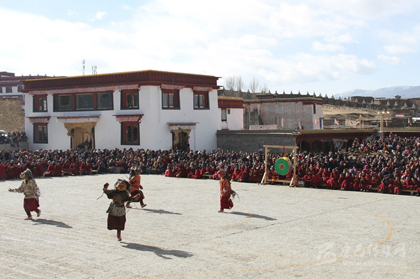 2月25日,是藏歷的12月29日,理塘縣長青春科爾寺舉行了盛大的“古多”儀軌活動。僧人在寺廟廣場表演“羌姆”,各區(qū)鄉(xiāng)鎮(zhèn)農(nóng)牧民群眾近萬人匯聚于此,觀看表演?!扒寄贰币鉃樘瘢遣貍鞣鸾讨腥谧诮绦?、藝術(shù)性為一體的法舞儀式,本地藏族群眾又稱其為“巴羌”,即“面具法舞”,寄寓了人們辭舊迎新、禳災(zāi)祈福的美好愿望。