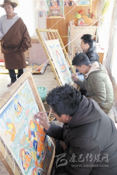 白玉河坡省級(jí)非遺代表性傳承人根秋單貞指導(dǎo)唐卡繪畫。