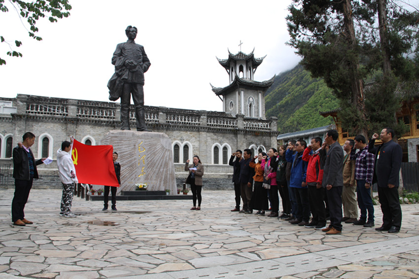 本網(wǎng)訊 (本網(wǎng)記者 秦松 攝影報道)日前,甘孜日報社全體黨員與群眾工作全覆蓋結(jié)對共建共創(chuàng)的海螺溝燕子溝鎮(zhèn)的躍進(jìn)坪村支部、南門關(guān)村支部、麻柳林村支部、喇嘛溝村支部的黨員,懷著崇敬的心情來到磨西長征紀(jì)念館毛主席塑像前,舉行緬懷革命先烈、重溫入黨誓詞活動。活動中,黨員們還與共建共創(chuàng)支部黨員進(jìn)行了座談。圖為宣誓活動現(xiàn)場。