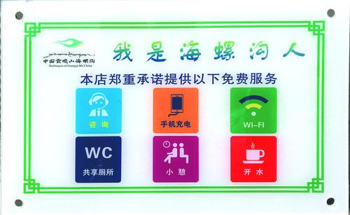 “我們長征大酒店在提高服務(wù)質(zhì)量的同時也掛了這個牌子,我們承諾為客人提供免費的開水、充電、共享廁所等服務(wù),讓客人對海螺溝有一個美好的印象,在海螺溝過的開心愉快?!遍L征大酒店負(fù)責(zé)人楊德黎說。