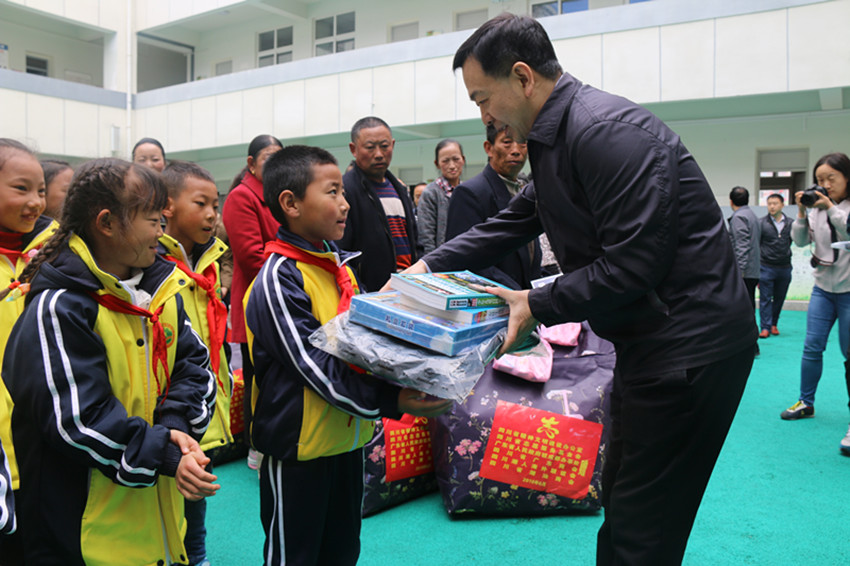 當天上午,“粵企代表為藏區(qū)困難群眾、貧困學生和留守兒童捐贈物資發(fā)放儀式”在康定市實驗小學舉行,廣東企業(yè)代表向該校20名留守兒童和困難學生發(fā)放了包括玩具、書包、圖書在內(nèi)的節(jié)日禮物,向康定市的30戶家庭困難的群眾發(fā)放了棉被、洗漱包、保溫杯等慰問品。