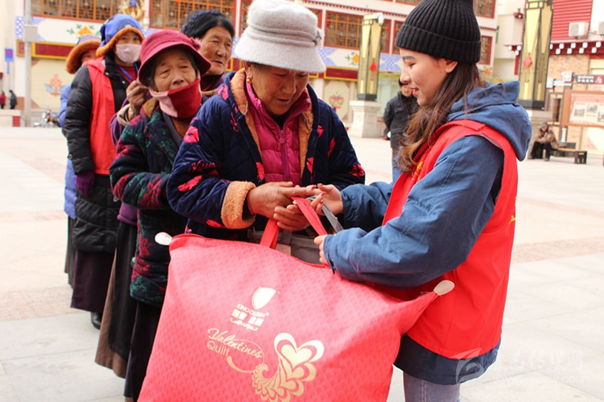 老人開心地接過志愿者發(fā)放的棉被。