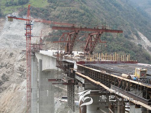 3月12日上午,記者在大崗山水電站S211復(fù)建公路工程(瀘石路)B標(biāo)段跨徑為296米的大渡河大橋(又名灣東大橋)的施工現(xiàn)場看到,高聳的吊裝機隆隆作響,T梁上鋼筋林立;戴著安全頭盔的施工人員正在精心“編織”鋼筋網(wǎng)陣,掛籃懸臂也同時在澆筑施工,大橋已初具雛形。連接大橋的聯(lián)合村隧道內(nèi),同樣一派忙碌的場面,挖掘機、運輸車等各類工程車往來進出,施工便道上馬達聲轟鳴;正在洞口緊張焊接的鉆孔臺架上劃出一道道閃亮的弧線;隧道內(nèi)燈火通明,工人們正有條不紊地在洞壁上鉆孔……