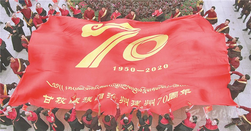 美妙的歌聲縈繞四方,鮮艷的旗幟迎風(fēng)飄揚。就在眾人忘情高歌之時,來自州歌舞團(tuán)的50多名演員將一面巨大的印有“建州70年Logo”的紅旗,在廣場正中鋪展開來。以這面旗幟為中心,先后到來的人們組成了三個同心圓,用歌聲禮贊甘孜州建州70周年。