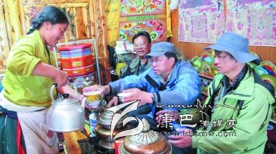 位于宗塔草原“大盆地”東邊山坡的降巴牧場(chǎng)在隊(duì)員們的心里也留下了深刻的印記。15日早上5點(diǎn)半隊(duì)員們就出發(fā)上了降巴牧場(chǎng)。朝霞映紅了天邊,紅云罩著青草牛糞味飄香的草坡。比采風(fēng)隊(duì)員們起得更早的牧人已擠完了牛奶,一個(gè)僅10 歲的女孩正在草坡上拾牛糞;牛毛帳篷里,勤勞的牧婦已打開(kāi)了牛奶分離器開(kāi)始分離酥油了……一問(wèn),方知牧民們今晨4點(diǎn)就起床勞作,干完早上的活兒,他們要趕到三公里遠(yuǎn)的“盆地”耍壩子,看賽馬。這個(gè)牧場(chǎng)靜謐潔凈得令人稱奇,青青的草坡上絕少有垃圾存留,沒(méi)見(jiàn)到一只兇惡的牧犬;按季節(jié)劃分的草場(chǎng)由整潔的網(wǎng)圍欄圈開(kāi),分隔有致;牧人舉家出門(mén),連帳篷門(mén)也不掩,據(jù)說(shuō)這里沒(méi)有偷盜發(fā)生,家人和諧;古老、平和的氣氛中,晨風(fēng)輕拂,野花青草搖曳,輕柔的晨霧中偶而傳來(lái)兩聲牛哞,讓人頓感心靜如水。對(duì)于長(zhǎng)期居住城市的人來(lái)說(shuō),這里無(wú)疑是“幽雅天堂”了。