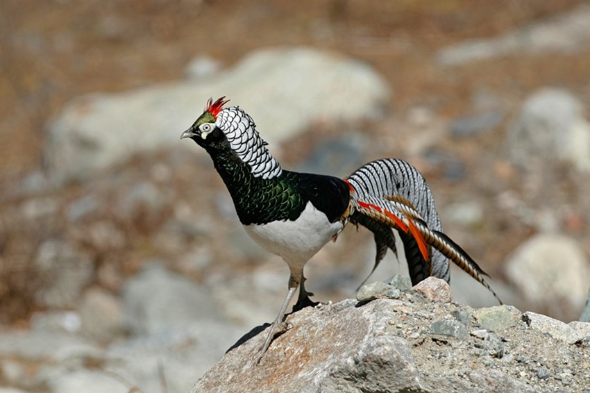白腹錦雞(學名:Chrysolophus amherstiae):藏語譯音:甲嚇破呷妞仁 別名:銅雞、寬寬雞 國家II級保護動物,見于瀘定、康定、丹巴、九龍等。 雄鳥全長約140厘米,雌鳥約60厘米。雄鳥頭頂、背、胸為金屬翠綠色;羽冠紫紅色;后頸披肩羽白色,具黑色羽緣;下背棕色,腰轉(zhuǎn)朱紅色。飛羽暗褐色。尾羽長,有黑白相間的云狀斑紋。腹部白色。嘴和腳藍灰色。雌鳥上體及尾大部棕?