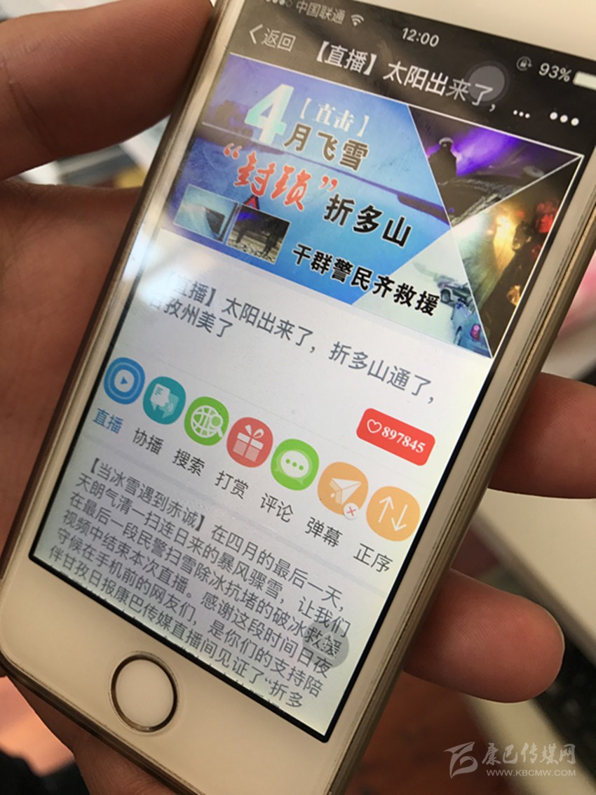 5月2日,隨著5.1小長假結(jié)束,甘孜日報(bào)對折多山突降大雪、引發(fā)交通堵塞的立體式報(bào)道告一段落,作為突發(fā)災(zāi)害性天氣,甘孜日報(bào)行動迅速,傳統(tǒng)媒體、掌上直播、康巴微信、甘孜發(fā)布等全媒體齊上陣,掌上直播《4月飛雪“封鎖”折多山,干群警民齊救援》,以其即時(shí)消息、圖片、視頻等海量信息,引發(fā)點(diǎn)擊“狂潮”,不到兩個(gè)小時(shí),點(diǎn)擊量即超過35萬人次,至小長假結(jié)束,點(diǎn)擊量近百萬人次;康巴傳媒微信《4月飛雪,千人馳援》點(diǎn)擊量超12萬人次;甘孜日報(bào)社對折多山大雪現(xiàn)場立體交叉式直播被新華社、中國新聞網(wǎng)、華西都市報(bào)封面新聞、網(wǎng)易新聞?lì)l道等州外媒體分別轉(zhuǎn)載或引用相關(guān)報(bào)道。我州應(yīng)急措施有力、有序,得到眾多媒體和網(wǎng)友紛紛點(diǎn)贊。州委常委、宣傳部長相洛稱贊甘孜日報(bào)在這次直播中,行動迅速、引導(dǎo)有力,既客觀報(bào)道了突發(fā)性災(zāi)害天氣對我州交通和旅游帶來的不利影響,更突出報(bào)道了我州和康定市采取的各項(xiàng)應(yīng)急措施,是一次媒體融合的有益嘗試。