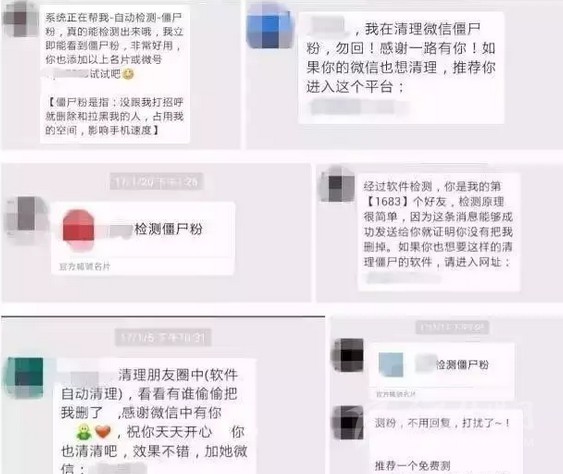 不少網(wǎng)友的微信都會(huì)收到類似“xxx你好,清理下朋友圈,效果不錯(cuò)。真是不清不知道,一清嚇一跳。需要清理可加微信***”這樣的信息,表示可以通過專業(yè)手段找到所有刪除、拉黑、或屏蔽自己的“僵尸粉”,清理微信的聯(lián)系人,可以“釋放手機(jī)內(nèi)存”。