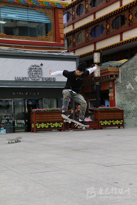 6月22日,世界滑板日,康定市情歌廣場,一群滑板少年舉著“GOTTA’318”大旗,正在演繹精彩。他們時而團(tuán)隊(duì)作業(yè),時而單兵作戰(zhàn),時而爭相競技,時而相互逗樂。當(dāng)他們舞動旗幟,蛇形而行,呼嘯而來,你會感受到蓬勃的青春氣息撲面而來;當(dāng)他們帶板直上滑桿,倏忽而過時,你會在那一剎那感到記憶一陣空白,然后發(fā)出一聲驚嘆;當(dāng)他們瞬間起跳,在空中360度轉(zhuǎn)體,然后像雄鷹一樣翱翔時,你會感覺歲月易老,對青春只有追憶;而當(dāng)他們競技“爭高”“望遠(yuǎn)”時,你會感受到那鍥而不舍的奮斗精神充盈你的脈管……