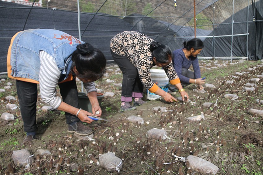 郭紅英(左一)同當(dāng)?shù)卮迕裨谠瑥?qiáng)的羊肚菌大棚內(nèi)務(wù)工。