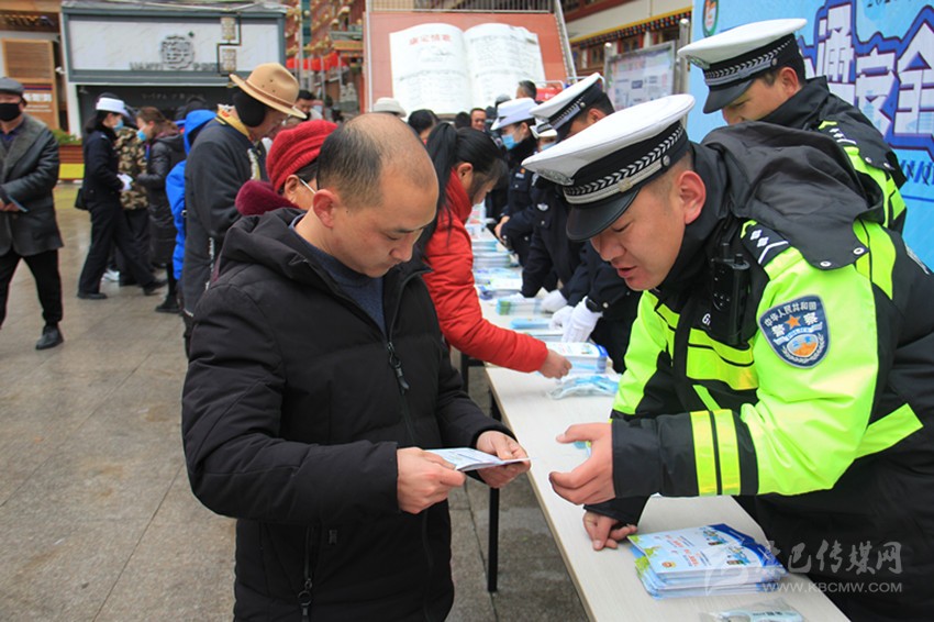 交警在康定情歌廣場(chǎng)開(kāi)展“一盔一帶”安全宣傳活動(dòng)。