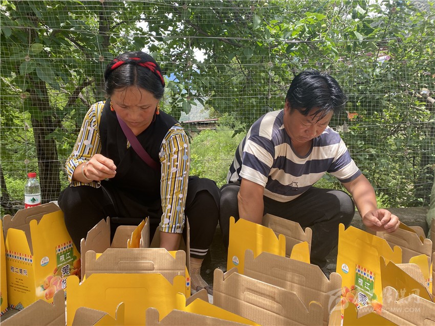 村民正在對(duì)黃桃進(jìn)行統(tǒng)一打包裝箱。