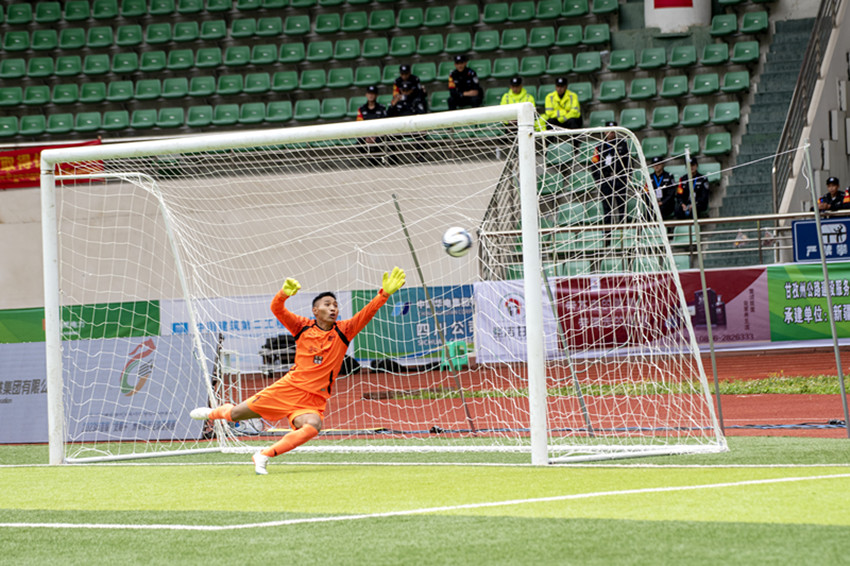 隨著主裁判吹哨發(fā)令,身穿白色球衣的甘南隊及藍(lán)色球衣的昌都隊球員各赴站位,迅速進(jìn)入狀態(tài)。上半場,甘南隊積極拼搶、快速進(jìn)攻、精準(zhǔn)傳球,很快主導(dǎo)場上局勢。而昌都隊雖后防穩(wěn)健,進(jìn)攻則顯得略為保守。第9分鐘,甘南隊員在大禁區(qū)前沿帶球晃過昌都隊員后,雙方爭奪激烈,甘南隊員倒地,裁判鳴哨,甘南隊獲得前場任意球機(jī)會。在此前比賽中已打入2球的33號球員索南道吉站上罰球點,短暫調(diào)整后打出一記弧線球,昌都隊門將撲救不及,足球應(yīng)聲入網(wǎng),甘南隊取得1:0領(lǐng)先。