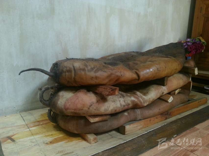 半干豬肉:在丹巴縣革什扎鄉(xiāng)有一種比較奇特的豬肉保存方法:將豬殺死后,不去毛,只在豬的腹部開一條口子取出內(nèi)臟,將血水清理干凈后用麻繩將腹部縫合。隨后用當(dāng)?shù)氐狞S泥漿敷在豬身上,在豬的身上形成一個(gè)厚約2厘米的殼,密不透風(fēng)。處理好后將其懸掛于灶塘之上,使黃泥在高溫的烘烤下快速硬化。如若發(fā)現(xiàn)黃泥層出現(xiàn)裂縫,立即用黃泥漿將其修復(fù)。等到第二年熱天時(shí),敲掉黃泥形成的硬殼,豬毛被輕松退去,豬肉依然比較新鮮。但這種保存新鮮豬肉的方法現(xiàn)在已經(jīng)很少見了,一是因?yàn)檫@種保存方法風(fēng)險(xiǎn)太大,稍有不慎豬肉就可能腐敗;二是如今物資供應(yīng)豐富,新鮮豬肉購(gòu)買方便,使得此種儲(chǔ)存方式失去了存在的價(jià)值。