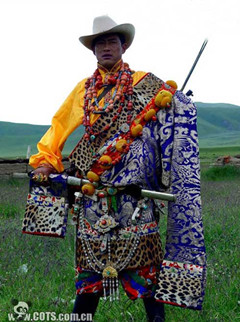 吐蕃時(shí)期   藏族服飾文化有了較大的發(fā)展。"中二丁王"時(shí)(相當(dāng)于中原西漢中期),南方雅隆河谷的吐蕃開(kāi)始了冶煉鐵、銅、銀等礦產(chǎn),為金屬飾品的出現(xiàn)創(chuàng)造了條件。藏史記載,公元三世紀(jì)的拉妥妥日年贊時(shí),吐蕃贊普的服飾巳與眾不同,出現(xiàn)了服飾等級(jí)的差異。史載松贊干布時(shí)期,吐蕃的歷史翻開(kāi)了新的一頁(yè),吐蕃文化得到迅速的發(fā)展,其服飾文化日漸發(fā)達(dá)。吐蕃奴隸制王朝等級(jí)森嚴(yán),在服飾上的表現(xiàn)也日臻完備。從反映吐蕃盛時(shí)的敦煌壁畫可看出,君臣服飾的等級(jí)差異,藏王一般只有贊普才能使用的三瓣寶冠箍住的有凹槽裝飾的無(wú)沿帽,呈紅色,通常高于一般人的帽子;藏王的侍從或臣下往往戴平頂無(wú)沿帽。衣袍的式樣也各有不同,官吏的章飾規(guī)定有一等瑟瑟,二等金,三等金包銀,四等銀,五等銅,六等鐵等大小兩類,共十二級(jí),裝在方圓三寸的盒子里掛在胸前,以區(qū)別職位的高低。武將的頭盔有形如塔的裝飾,戰(zhàn)士頭盔上有三只彩旗以表示出生的年月,隨著"惟以淬礪為業(yè)"的吐蕃冶煉業(yè)的發(fā)展,軍隊(duì)的鎧胄日趨精良,有的周身僅露兩個(gè)眼窩,勁弓利刃常不能破,其威嚴(yán)、勇猛之氣在今天大昭寺壁畫的吐蕃武士像中尚歷歷在目。吐蕃貴族不僅本人穿著華貴,還在聚會(huì)宴客時(shí),把傭人裝飾起來(lái)。而作為贊普的松贊干布則用一種紅帶子包頭,身著長(zhǎng)袍,足穿腳尖朝上的靴子,據(jù)《紅史》載,這種王服是受波斯王朝的影響,反映了文化交往已影響到了服飾文化層次,而從松贊干布伊始的吐蕃與中原的密切交往,兩種民族文化的長(zhǎng)期接觸更為藏族服飾的發(fā)展注入了新鮮血液。史載文成公主進(jìn)藏時(shí),帶入諸種花緞、錦、綾羅與諸色衣料二萬(wàn)匹,還有大量的金玉器具。松贊干布及吐蕃大臣紛紛自行去掉氈裘,改穿絹綺。近代西藏的高級(jí)官吏,頭發(fā)綰成一髻,戴金翅白紗帽,這是唐代進(jìn)士的服飾。此外,還采納文成公主建議,令國(guó)人禁止"赭面"(用油涂面),文成公主進(jìn)藏還帶來(lái)了種植蠶桑和紡織技術(shù),"植??椊z兮"大大的促進(jìn)了吐蕃服飾技藝的發(fā)展,青海海西州都蘭出土的大批吐蕃服飾文物,真實(shí)、生動(dòng)地反映了吐蕃服飾的工藝水平。服裝的織物紋樣多為聯(lián)珠動(dòng)物紋,裝飾品的金質(zhì)首飾、佩飾的精美使人嘆為觀止。今天藏族婦女飾品的鑲嵌形制,可以從這些文物中找到原型。斯坦因的《古代中亞文化遺跡》一書(shū)也曾提到:"在吐蕃發(fā)現(xiàn)的遺物中,有很多具有花紋的絲織物,花紋中有些是印的,有些是織的,花紋圖象的變化很多,這一點(diǎn)很可以表示吐蕃商業(yè)的地位,……大概是中國(guó)與西亞之間的貿(mào)易重點(diǎn)。"頻繁的交往促進(jìn)了吐蕃經(jīng)濟(jì)的發(fā)展,也促進(jìn)了服飾文化的發(fā)展。 吐蕃是一個(gè)軍事帝國(guó),在它的發(fā)展過(guò)程中征服融合了青藏高原及其邊緣地區(qū)的許多其他民族,這是造成今天各地區(qū)藏族之間文化差異的重要原因。在服飾的表現(xiàn)上也是如此。吐蕃時(shí)代這種差異主要表現(xiàn)為東女、附國(guó)、黨項(xiàng)等部落服飾的不同,東女部落住在康延川(今昌都),處于母系氏族社會(huì)發(fā)展階段,其女王穿青毛綾(氆氌)裙,上披青袍,袖長(zhǎng)到地,冬穿用文錦裝飾的羔裘。發(fā)作鬟髻狀,兩耳垂珰(耳環(huán))。足穿革素(皮靴)。一般男子披發(fā),婦女辨發(fā),男女都用彩色涂面。王死居喪三年,不易服,不梳洗。附國(guó)是以今四川甘孜為中心,包括今四川阿壩一帶的嘉絨藏人的藏羌融合體。他們頭戴圓形皮帽,或帶幕離佳(即面罩一類飾物,為婦女所帶)。身披毛曷毛(氆氌一類)、皮裘,穿牛皮鞋。頸系鐵索,手貫鐵釧。王與酋長(zhǎng)以金為首飾,胸前掛著三寸長(zhǎng)的金花。黨項(xiàng)則是純游牧部落,"服氈襲褐,披氈以為上飾",早在北周時(shí)巳能制造精美的犀甲、鐵鎧。四川西北部還有屬黨項(xiàng)部落聯(lián)盟的鄧至、武興國(guó)和宕昌等,服飾習(xí)俗為頭藏烏皂突騎帽,身穿長(zhǎng)袍,下著小口褲、足穿皮靴,與今四川牧區(qū)藏族服飾相似。此外青海地區(qū)有吐谷渾,貴婦人披錦袍,戴金花冠。如女發(fā)型為辨發(fā)披于后,后飾珠貝,以繁多為高貴,這一服飾與今青海藏族婦女大致相同。這些地區(qū)服飾特征是今天各地不同藏族服飾的母型。 吐蕃王朝崩潰后,從九世紀(jì)中期到第十一世紀(jì)的二百余年間,西藏社會(huì)一直處于分裂割據(jù)的混亂狀況。這一時(shí)期戰(zhàn)亂不堪,服飾藝術(shù)的發(fā)展也難免厄運(yùn),停滯不前,而與戰(zhàn)爭(zhēng)有關(guān)的武士服飾卻濟(jì)時(shí)發(fā)展。在西藏阿里古格王國(guó)的遺址中,發(fā)掘有大量古代武士的盔甲和武器。其鎧甲多為鋼片甲,是用細(xì)皮條串結(jié)鋼片而成,串結(jié)方法頗為復(fù)雜,武器中的盾牌,系用藤條編織為圓形,直徑八十厘米,正面鑲有銅質(zhì)加固件,銅件上雕刻有細(xì)密的紋飾,故亦可謂是銅飾件,背面有四個(gè)銅環(huán),環(huán)間可用皮條相連,作握柄之用,無(wú)論這些服飾和兵器,是西藏本地生產(chǎn),還是外來(lái)流入,都說(shuō)明其時(shí)西藏的武士