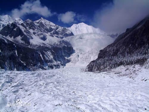 沿冰川上行三公里,繞過黑松林,即可望見這條大冰瀑布。冰瀑布寬達(dá)1100米,落差1080米,由無數(shù)極其巨大的光芒四射的冰塊組成,仿佛從藍(lán)天直泄而下的一道銀河。除非你親眼見到,沒有任何詞匯能形容它的瑰麗笥偉大。冰川最高點(diǎn)的海撥為6750米,而最下端的海撥高度僅為2850米,它不但是低緯度低海撥的冰川,而且是落差最大的冰川。